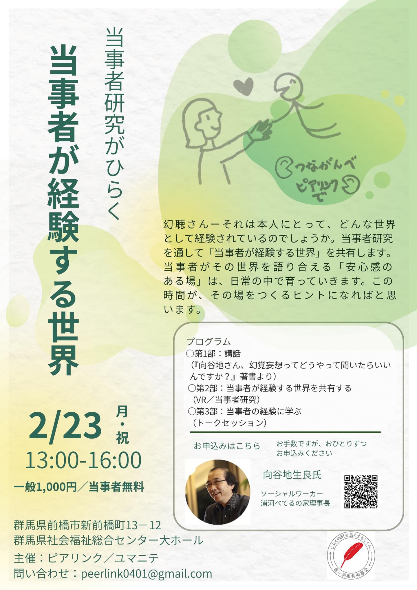 このたび、2/23(月・祝)に群馬県社会福祉総合センター(大ホール)にて、シンポジウム「当事者研究でひらく『当事者が経験する世界』」を開催します。